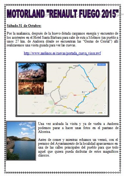 Ya se acerca la clásica quedada del club que hacemos coincidir con el evento clásico anual de Motorland. Para poder ir preparando el evento, seria de gran ayuda que informéis los que tenéis firme intención de asistir, siendo comprensible que por el tiempo que queda no se pueda confirmar, pero para tener una idea aproximada de los participantes, reitero que seria de gran ayuda tener una idea del número de asistentes para buscar posibles opciones de alojamiento. gracias y animo!!! Para los que asistamos el sábado, se ha elegido Andorra, localidad en la que ya hicimos una quedada. El Hotel Santa Barbara, es el elegido, quien quiera hacer reserva que solicite una de las habitaciones bloqueadas a nombre de Pablo Fernández. Precio 65€ habitacion dobre con desayuno e iva incluidos. http://www.hotelsantabarbara.es/Asistentes: SABADO DOMINGO FINDE DUDASeviJaviToniDavid PascualJulioJoseteNataliaHectorRafaelMiguelon[imghttp://www.renaultfuegoclub.com/foro/download/file.php?mode=view&id=219][/img]